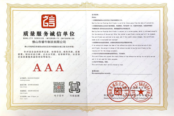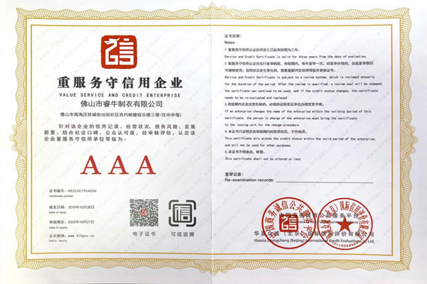 佛山市睿牛制衣有限公司——3A級質(zhì)量服務(wù)誠信單位;