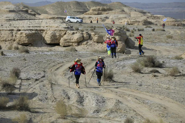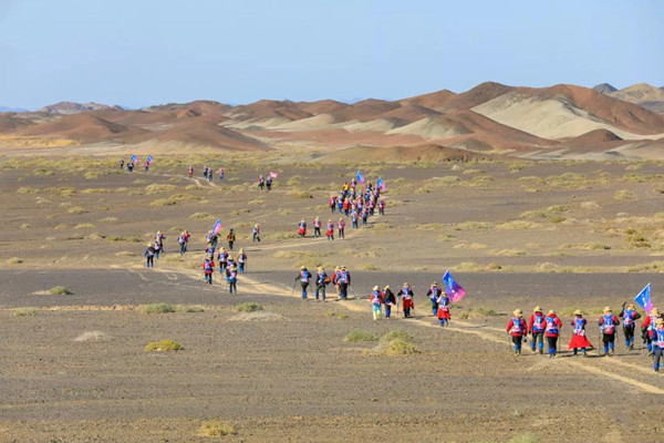 第一天是8小時25公里,牛商們在太陽還沒完全升起來就開始了遠征前的熱身,原力專業的教練,激昂的樂章,鼓舞著雄心勃勃的牛商們,一聲號令全體出發,萬馬奔騰的節奏開始了,彩旗飄飄,紅裝戰衣,藍色背包,熒光粉的名號牌,浩浩蕩蕩,塵土飛揚!戈壁我們來了!