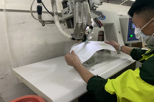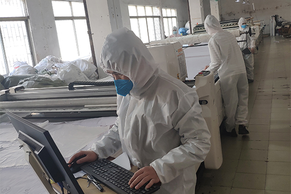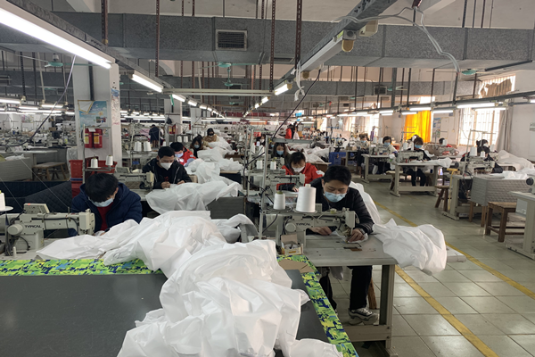 做好上面的防護準備工作,員工(身體狀況良好的)也可以放心的來到工廠上班了,現在思諾華制衣的員工也已經陸陸續續的來到工廠,全力開展生產防護服,抗擊疫情,隔離病毒但不隔離愛,請觀看以下思諾華制衣工廠實拍生產民用防護服的圖片(員工均佩戴口罩、身體狀況均良好):