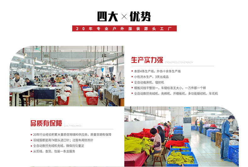 定制沖鋒衣加工生產重要的是供貨期是否能保證,訂單數量限制無論是對于沖鋒衣批發商,還是對于企事業單位而言,都不可能是什么好事情。能做到“大訂單不含糊,小訂單不馬虎”的定制廠家,才能真正讓人放心!